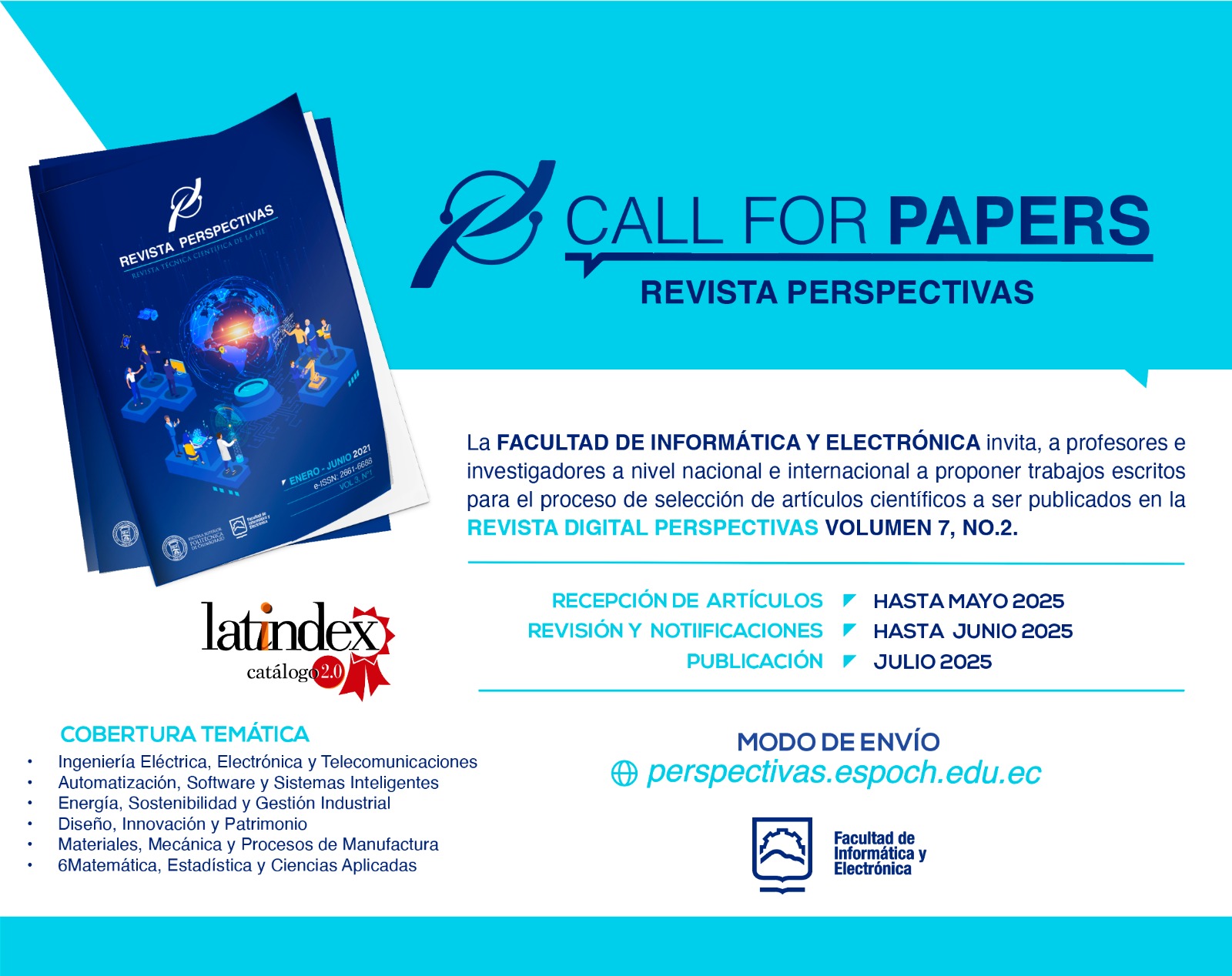 La revista técnico-científica Perspectivas de la Escuela Superior Politécnica de Chimborazo se enfoca en la difusión de trabajos escritos originales en areas de desarrollo científico y aplicaciones de ingeniería. El equipo de revisores de la revista Perspectivas son distingidos investigadores internos y externos a nuestra institución editora, los mismos que se especilizan en las áreas de interes de la revista. La convocatoria de recepción de manuscritos se encuentra abierta, los manuscritos aceptados son publicados en alguno de los dos números del año.
